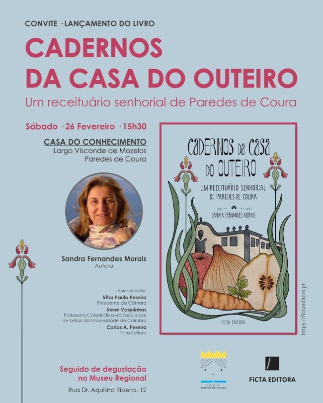 Cadernos da Casa do Outeiro - Um receituário senhorial de Paredes de Coura, por Sandra Fernandes Morais, é apresentado na Casa do Conhecimento pelas 15h30 de sábado, seguido de degustação no Museu Regional.