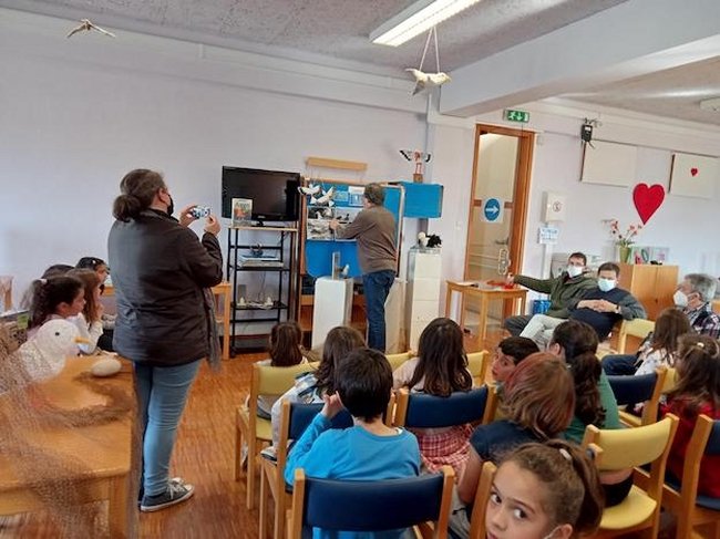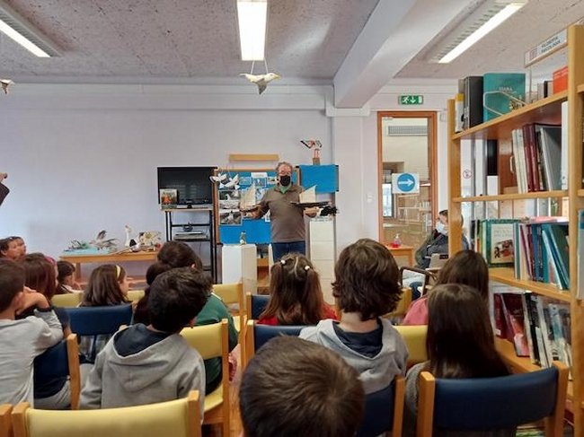 A Biblioteca da Escola Básica e Secundária do Vale do Âncora recebeu ao início da tarde do dia 23 de fevereiro uma visita muito especial. Com uma assistência constituída pelas duas classes do segundo ano, das professoras Deolinda Porto e Márcia Esteves - que estão a desenvolver nas suas aulas um interessante projeto sobre as gaivotas e os efeitos perniciosos da sua presença em áreas urbanas - dois elementos do NUCEARTES (Núcleo de Estudos e Artes do Vale do Âncora), Brito Ribeiro e Rafael Capela, aprofundaram primeiro a informação sobre essa temática, cada vez mais atual nas cidades e vilas costeiras, respondendo depois a algumas questões levantadas pelos alunos.