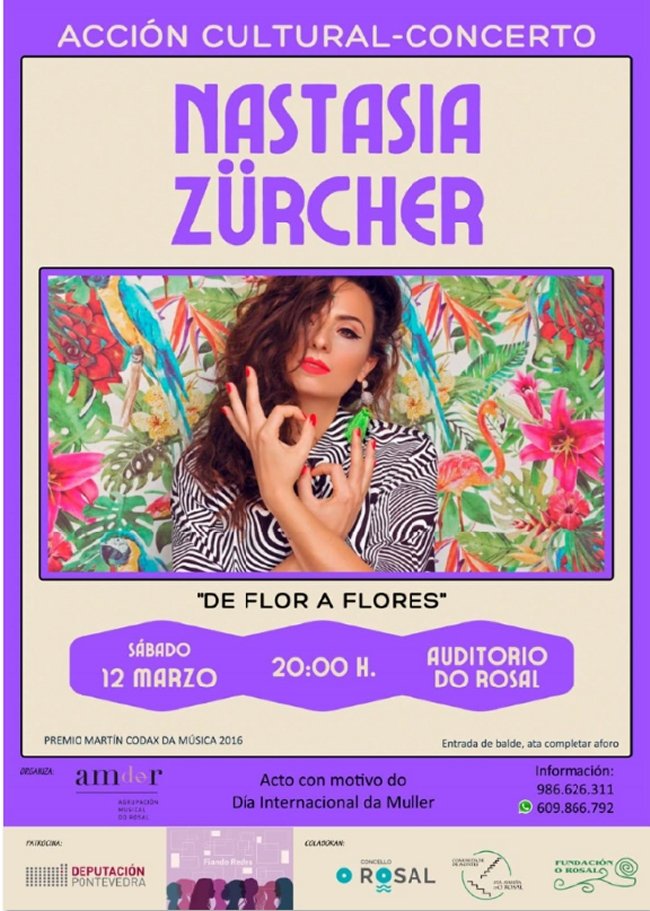 A voz e enerxía de Nastasia Zürcher encherá esta fin de semana o auditorio municipal do Rosal para seguir reivindicando a igualdade. Co gallo do Día Internacional da Muller, este sábado 12 a vocalista e compositora galego-suíza ofrecerá un concerto organizado pola Agrupación Musical do Rosal en colaboración co Concello dentro do programa Fiando Redes da Deputación de Pontevedra, unha iniciativa que pretende fomentar o asociacionismo feminino e concienciar a favor da igualdade mediante propostas culturais inclusivas e con perspectiva de xénero.