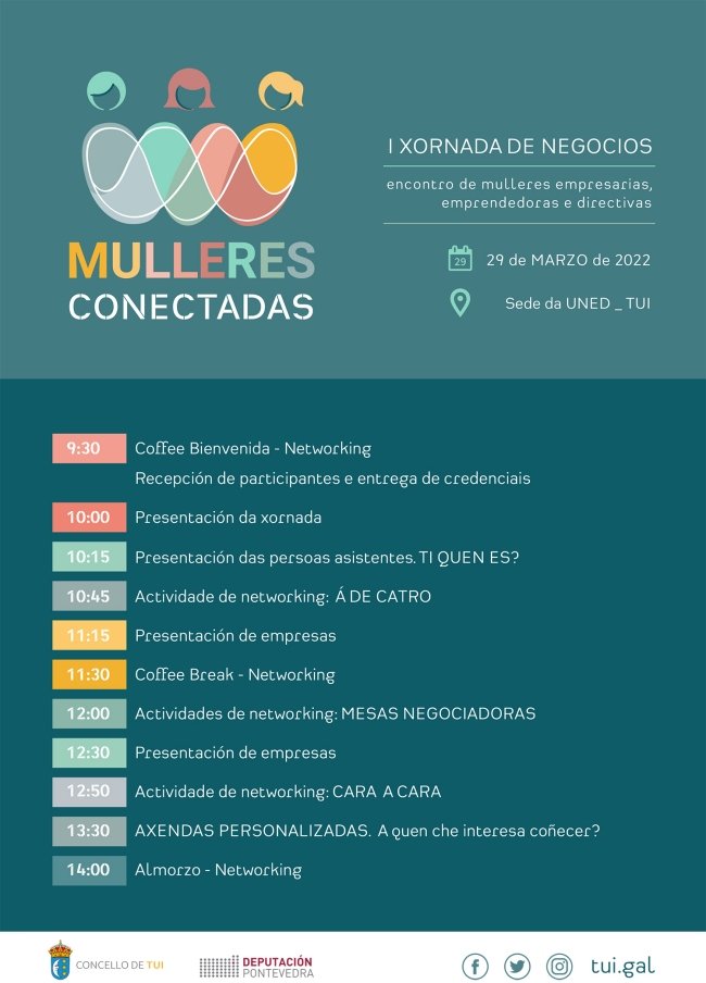 "Mulleres Conectadas" é o título do primeira xornada de negocios que se vai celebrar o martes, 29 de marzo, na Aula da UNED de Tui. Está organizado polo Concello de Tui, a través da concellería de igualdade, dentro programación do mes de marzo.