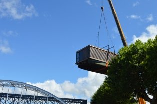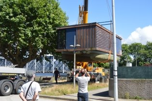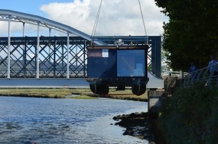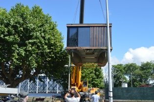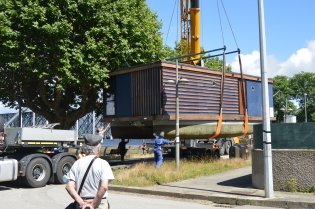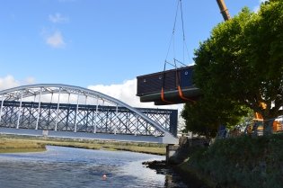 Uma grua-camião espanhola transportou e colocou a estrutura flutuanteno Rio Coura, fazendo-a passar sobre os plátanos da Av. Entre Pontes, cujo trânsito nesta artéria esteve interdito nesse dia.