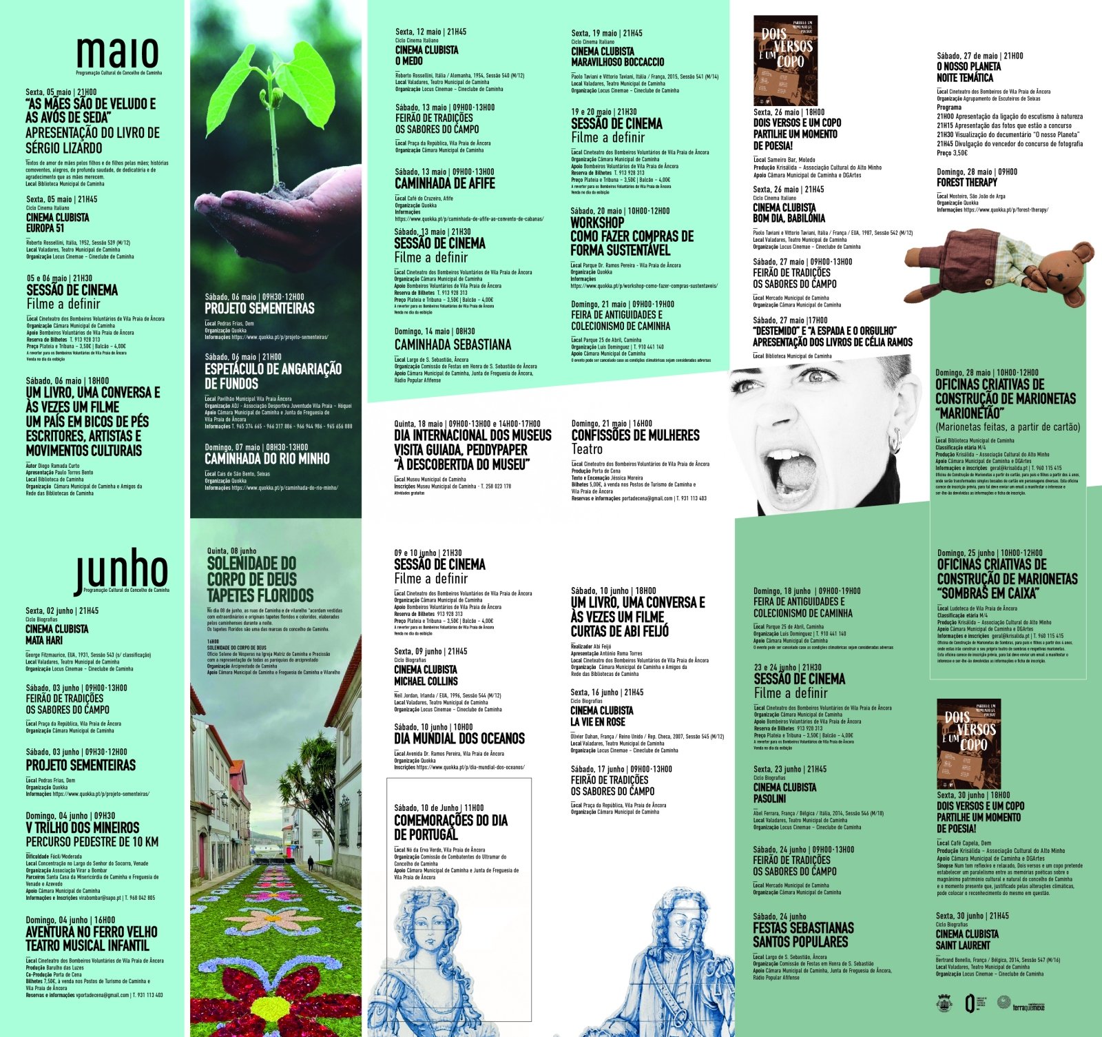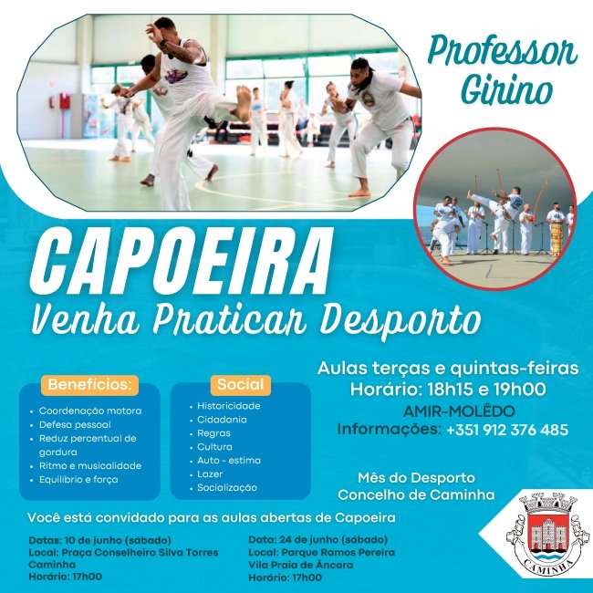 Depois de termos dedicado o mês de março ao Ambiente e à Sustentabilidade, o de abril à Saúde e o Bem-Estar, o de maio ao Mar, aos Rios e à Pesca, vamos dedicar este mês, como já referimos, ao Desporto com atividades desportivas das mais variadas modalidades, para todos os gostos e idades, com destaque para o eLiga Portugal Finals, as caminhadas; o Trilho dos Mineiros, a VII Meia Maratona Sunset de Caminha; aulas de capoeira, aulas abertas de stand up paddle, Kayak e Remo, caminhadas; corridas; pesca desportiva; voleibol na areia, entre muitas outras.
