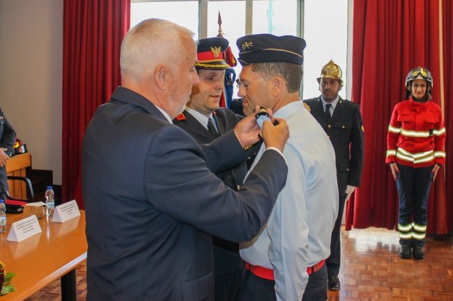 Seguidamente, foram colocados os respectivos capacetes aos recém promovidos voluntários (Nuno Ferreira, Nicolás Sales, Vítor Rodrigues, Hugo Catarino e Rodrigo Vieira) e entregues distinções honoríficas da Liga aos Bombeiros a Joaquim Guerreiro, Gaspar Passos, Adriano Gonçalves e Francisco Branco.
