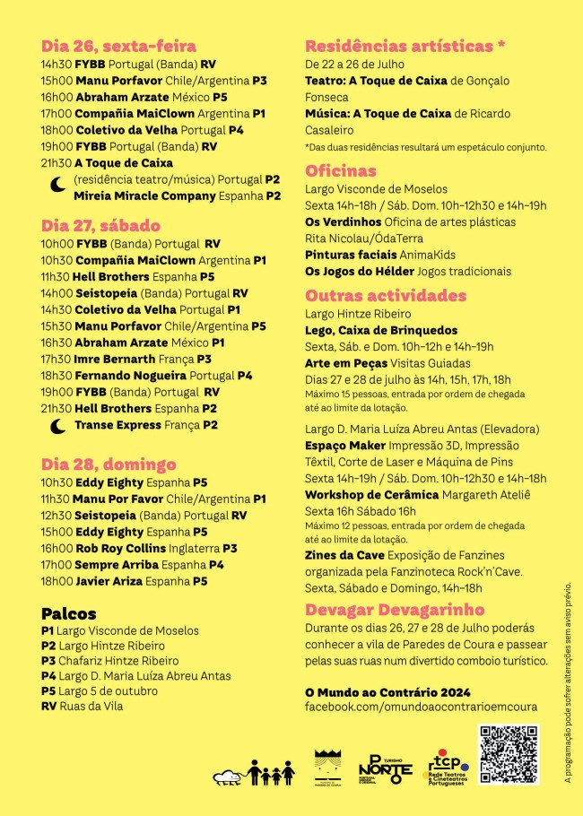 Organizado pelo Município de Paredes de Coura, ‘O Mundo ao Contrário’ não só reúne artistas nacionais e estrangeiros como também desafia os mais novos a participarem em oficinas de artes plásticas Os Verdinhos, jogos tradicionais Os Jogos do Hélder, pinturas faciais AnimaKids, workshop de cerâmica no Margareth Ateliê, construções Lego® na Caixa dos Brinquedos e visitas guiadas ao Arte em Peças, impressão 3D, impressão têxtil, corte de lazer e máquina de pins no Espaço Maker e a exposição de fanzines Zines na Cave (Fanzinoteca Rock’n’Cave), promovendo liberdade à imaginação e criatividade, entre muitas outras propostas para rir e divertir, num evento muito especial, onde se vira “de pernas para o ar” a rotina e a rigidez, permitindo que reine o inesperado e a fantasia.