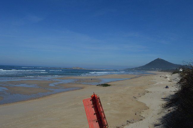 Mas as ondas ainda fazem estragos, apesar da acalmia, e mais um sinal de aviso à navegação existente sobre o cordão dunar a escassos metros da parte norte do paredão, não resistiu e encontra-se tombado, como a foto documenta.