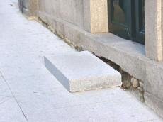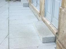 Inexistência de soleiras nos passeios, obrigando à colocação improvisada de pedras em granito para acesso aos comércios