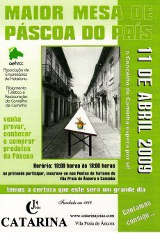 A Associação de Empresários de Hotelaria, Alojamento Turístico e Restauração do Concelho de Caminha (AEHRCC) vai organizar "A MAIOR MESA DE PÁSCOA DO PAÍS" no dia 11 de Abril, entre as 10 horas da manhã e as 6 da tarde, na Rua Direita, em Caminha.