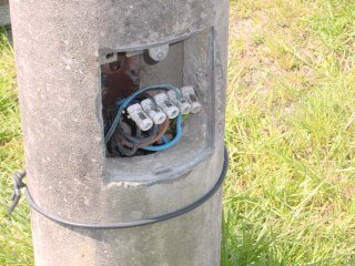 Fios de electricidade à vista num dos postes de iluminação do arruamento paralelo à Av. Dantas Carneiro, por detrás do mercado municipal de Caminha.