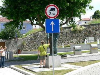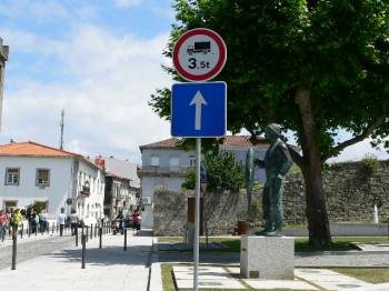 Estátua encoberta por placas de sinalização Portas de Viana Caminha