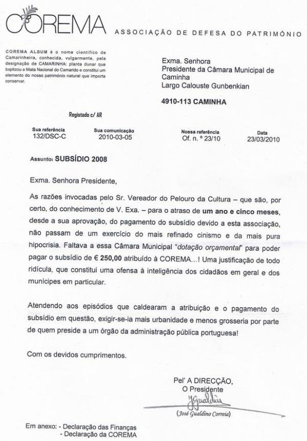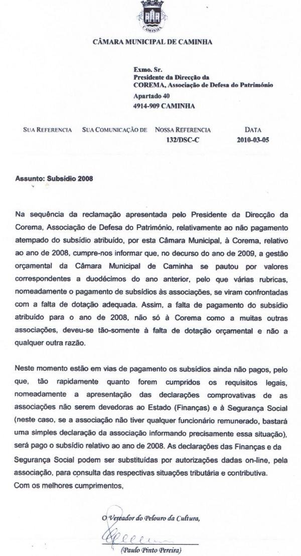 Relacionado com o pagamento do subsídio anual (referente a 2008) atribuído pela Câmara Municipal de Caminha, aprovado em reunião do executivo de 13/10/2008, a COREMA remeteu, no ano transacto, três ofícios em carta registada c/ AR a solicitar esclarecimentos sobre o assunto, que ficaram sem resposta. A situação foi posteriormente denunciada num comunicado tornado público em 06/10/2009. O executivo camarário apenas agora se dignou responder, e fê-lo na sequência da reclamação que apresentámos, em 23/12/2009, no "Livro Amarelo". O conteúdo do ofício que nos foi remetido em 05/03/2010 mereceu a resposta que anexamos.