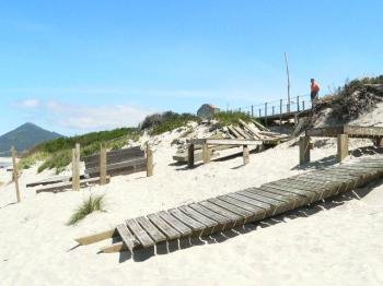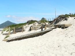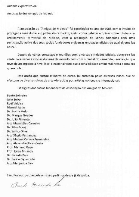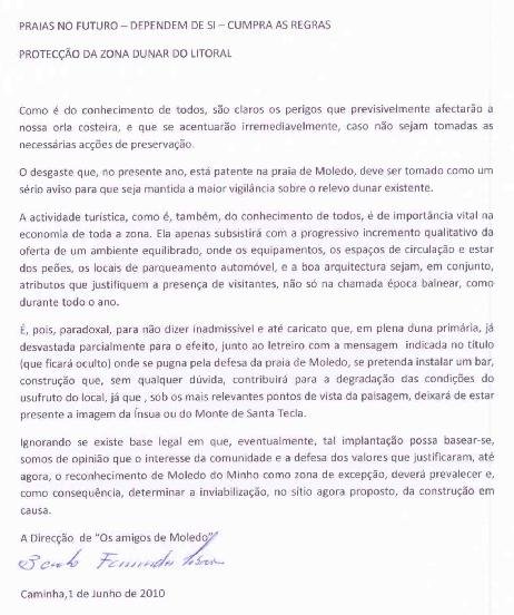 "Praias no futuro - Dependem de si - Cumpra as regras", pode ler-se nos painéis em madeira colocados no cordão dunar, o qual foi reforçado com a implantação de estacaria que permitisse fixar as areias e permitir o crescimento de vegetação rasteira, entretanto afectadas pela crescida das águas do oceano em anos anteriores, que "comeram (as dunas) e continuam a fazê-lo" nesta parte norte da praia de Moledo. Esta situação inquietou igualmente a Junta de Freguesia, interrogando-se Joaquim Seixo, presidente da autarquia, como foi possível autorizar o bar em terrenos que pertencem à autarquia, "sem nos comunicarem nada". Por seu lado, a Corema vai apresentar queixa junto da Ministra do Ambiente, atendendo entre outros considerandos, a que a linha de costa se alterou por efeito do mar, pelo que "o Ministério do Ambiente deveria ter tido em conta as concessões dos bares". A Associação Regional Hidrográfica autorizou a instalação no local já definido previamente no Plano de Ordenamento da Orla Costeira (POOC), conforme nos confirmou o vereador Mário Patrício. Sucedeu que no passado, o concessionário sempre preferiu montar o bar no plano da praia, não causando objecções, mas, este ano, devido à subida do nível das águas, optou por instalá-lo no sítio estabelecido pelo POOC, daí resultando a polémica. Adiantou este autarca que a Câmara se limitou a emitir os documentos destinados ao pagamento das taxas respeitantes à ligação da rede de águas, pretendendo agora que a ARH esclareça se o bar se encontra em terrenos da Junta de Moledo, como esta reclama, ou do domínio público marítimo.