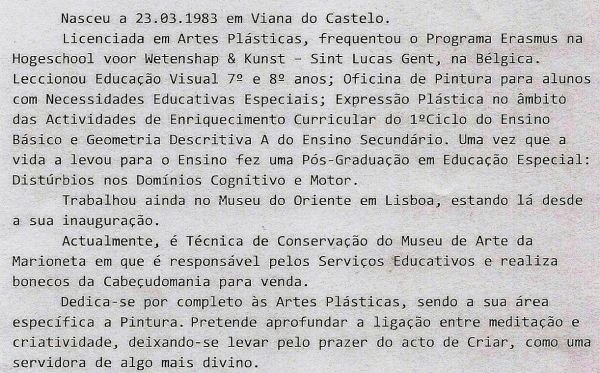 Frequenta Mestrado em Artes Visuais pela F.P.C.E.U.P / F.B.A.U.P.