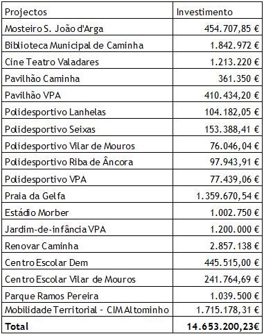 A Câmara de Caminha elencou uma série de obras a concretizar, ou já em curso, no concelho, no valor de 15 milhões de euros, e que serão comparticipadas entre 75 e 80% por fundos comunitários, dentro do Quadro de Referência Estratégico Nacional que culminará em 2013: