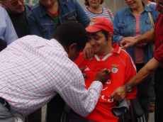 Já de saída, Eusébio dirigiu-se até junto de um jovem caminhense que o aguardava numa carreira de rodas, vítima de um atropelamento há uns anos atrás, conversou com ele e assinou o seu nome na camisola vermelha que envergava.