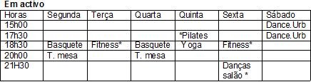 O basquete e Ténis de mesa, realiza se ambos no mesmo horário(gratuito) sábado das 10h00 as 11h00