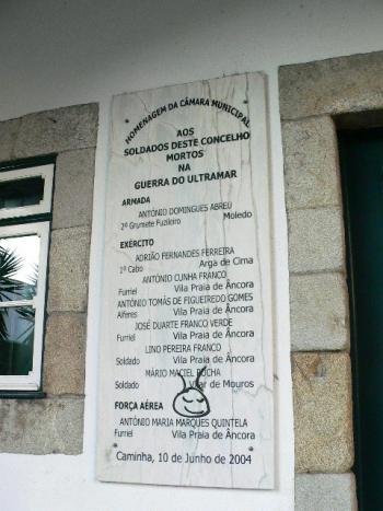 Grafiti numa das lápides de homenagem a soldados caminhenses perecidos na Guerra Colonial, existentes à entrada do Posto de Turismo de Caminha, a necessitar de ser limpo, como sucedeu com outros escritos aparecidos no apeadeiro de Vila Praia de Âncora, esses, rapidamente eliminados