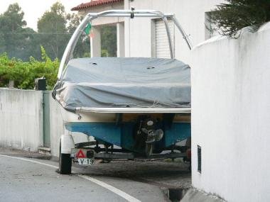 Barco estacionado com um rodado do atrelado na faixa de rodagem em zona de curvas perigosas.