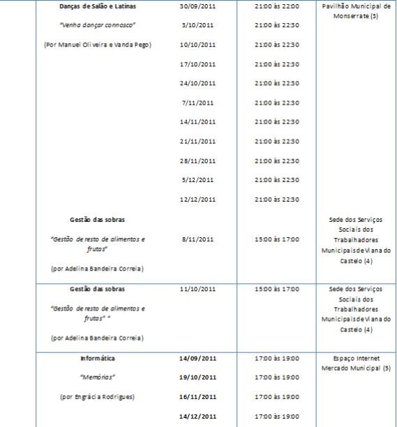 As actividades do projecto serão programadas e divulgadas semestralmente, de Setembro a Dezembro de 2011, estão já calendarizadas sessões de yoga, História de Arte, danças clássicas e Latinas, informática, gestão das sobras e conservação e restauro.