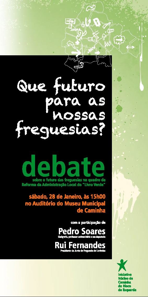"Que futuro para as nossas freguesias?" é a interrogação que dá o mote para um debate sobre a proposta do governo de reorganização administrativa local - o chamado "Livro Verde" - para o qual o núcleo do concelho de Caminha do Bloco de Esquerda convoca os munícipes e eleitos caminhenses e outros interessados, independentemente das suas simpatias partidárias. A iniciativa está marcada para o próximo sábado, 28 de Janeiro, pelas 15 h, no Auditório do Museu Municipal de Caminha e estão previstas intervenções iniciais de Pedro Soares, ex-deputado do BE eleito por Braga, geógrafo e professor universitário, e de Rui Fernandes, Presidente da Junta de Freguesia de Lanhelas, após o que seguirá um debate aberto aos presentes.