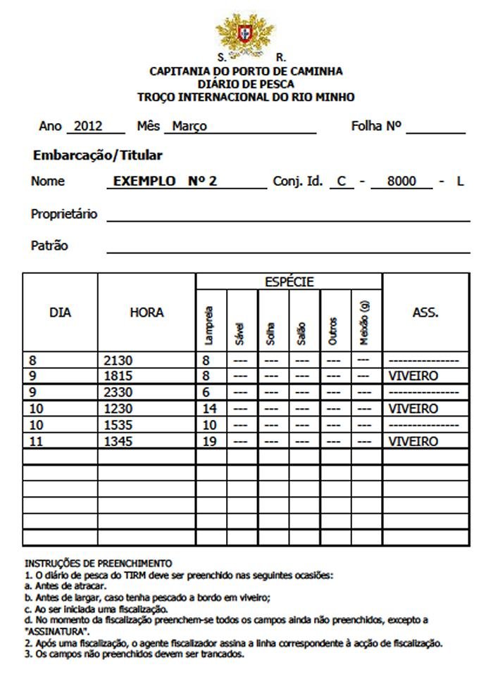 assinatura. No final da mare preenchem-se as capturas, nao incluindo o pescado