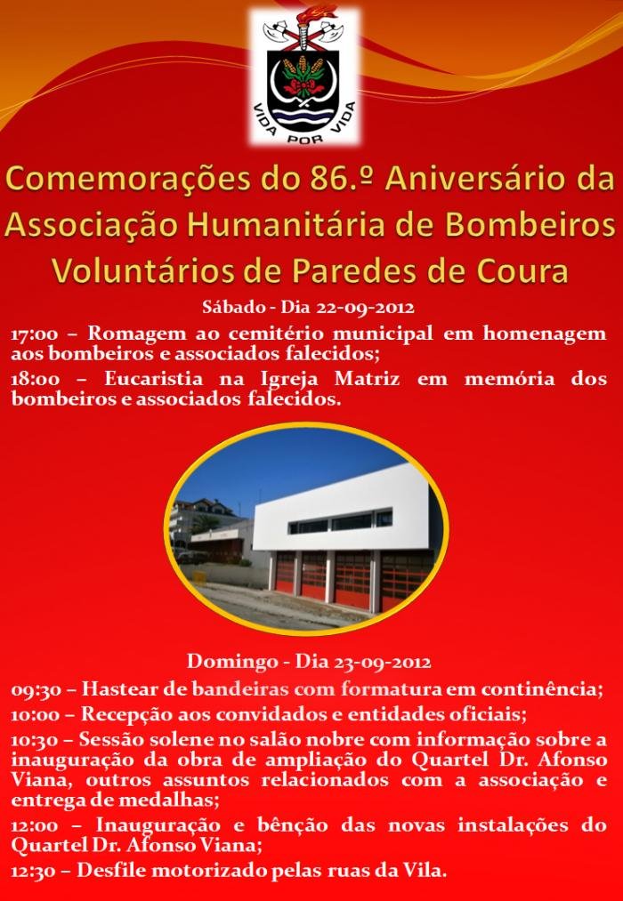 As comemorações solenes do 86.º aniversário da AHBVPC, onde se incluí a inauguração da ampliação do Quartel Dr. Afonso Viana, ocorrerão nos próximos dias 22 e 23 de Setembro.