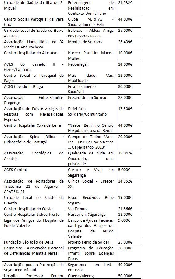 | VIANA DO CASTELO CONTA COM O APOIO DA MISSÃO SORRISO A Missão Sorriso vai apoiar com uma verba total no valor de 27.500€ duas instituições do distrito de Viana do Castelo. A Unidade Local de Saúde do Alto Minho vai ser apadrinhada com uma verba de 10.000€ para o projeto "Prevenir a Cegueira em Viana do Castelo", enquanto o Centro Social e Cultural de Vila Praia de Âncora recebe um montante de 17.500€ para concretizar o projeto "Âncoras". "Prevenir a Cegueira em Viana do Castelo" é o projeto da Unidade Local de Saúde do Alto Minho e que contará com um donativo da Missão Sorriso no valor de 10.000€. Este iniciativa tem por objetivo promover o rastreio universal de ambliopia a todas as crianças do distrito de Viana do Castelo, de forma a assegurar a correção em tempo útil. As causas mais frequentes são os erros refrativos e os estrabismos, que representam cerca de 99% das causas de ambliopia. O rasteio visual aos 15 meses e 4 anos de idade, permitirá ganhos importantes quer em termos de saúde, como económicos. O projeto "Âncoras", do Centro Social e Cultural de Vila Praia de Âncora, recebe um montante de 17.500 para financiar o projeto que visa criar uma casa que receba idosos (30), jovens estudantes oriundos dos PALOPS (15) e que garanta apoio domiciliário alargado às 24 horas com serviço de teleassistência. O "Âncoras" tem como objetivo geral promover a interação social prevenindo situações de isolamento e discriminação social e valorizar as relações intergeracionais, interculturais e o envelhecimento ativo dos idosos residente no concelho Caminha. Recordamos que pelo 10º ano consecutivo os portugueses juntaram-se à Missão Sorriso com uma grandiosa prova de solidariedade, envolvimento e determinação, angariando cerca de 1.4 milhões de Euros. Deste valor foram distribuídos 912 mil euros por 43 instituições portuguesas para a implementação de projetos nas áreas da Saúde Infantil, Envelhecimento Ativo e Luta Contra a Fome, contribuindo para a melhoria das condições de vida das crianças e seniores. O restante valor foi angariado através da campanha de recolha de Alimentos, em parceria com a Cruz Vermelha Portuguesa que permitiu doar 522 mil Euros em alimentos que ajudaram certamente muitas famílias que procuram ajuda, bem como do Jogo Solidário Portugal-Equador, resultante da parceria com a Federação Portuguesa de Futebol, no qual foram doados 50 mil euros à Missão Sorriso. De salientar que desde 2003, a Missão Sorriso já angariou cerca de 6.9 milhões de Euros para a aquisição e melhoria de equipamentos hospitalares e materiais diversos, contribuindo para a melhoria de prestação de cuidados de saúde a crianças e seniores de todo o país. Este balanço de 10 anos é a prova verdadeira do reconhecimento público já alcançado por este projeto, que conta com o apoio de todos os portugueses. Mais uma vez o Continente continuará a dar todo o seu contributo, empenhado para que a Missão Sorriso continue a desenvolver mais e melhores respostas sociais, ajudando cada vez mais famílias portuguesas a viverem histórias felizes. 43 Instituições apoiadas pela Missão Sorriso 2012