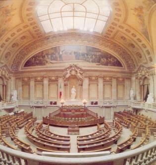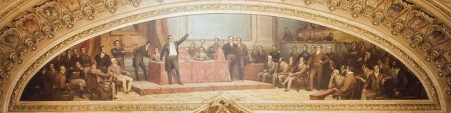 o arquiteto seixense Ventura Terra — mas a sua decoração artística demorou anos a completar, sendo entregue por concurso aos mais distintos escultores e pintores portugueses do início de novecentos. Domina-a uma grandiosa tela em elipse de 22 metros de largura por 5 de altura, que evoca as Cortes Constituintes de 1821-1822, reunidas na biblioteca do Palácio das Necessidades. Entre os quarenta deputados vintistas retratados a ouvirem atentamente Manuel Fernandes Tomás, surge em lugar de destaque, à direita do orador, a figura soerguida de
