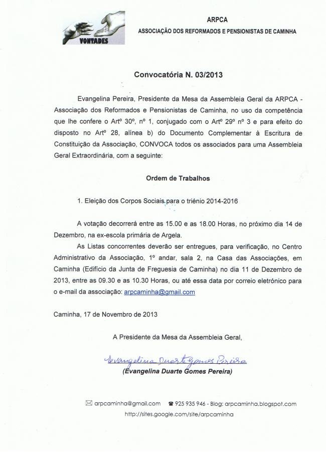 Não havendo instrumentos legais para refazer os órgãos sociais, foi comunicado a todos os associados que se realizaria uma Assembleia Geral Extraordinária no próximo dia catorze de Dezembro, com um único ponto: Eleições para os Corpos Sociais da Associação, que decorrerão naquela data, entre as quinze e as dezoito horas, nas instalações de Argela.