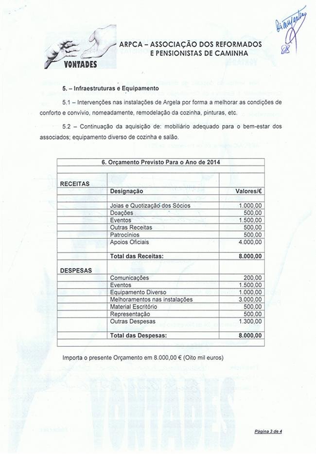 1. Apreciação e Votação do Programa de Ação e Orçamento para 2014. Apresentado pela Direção da ARPCA, os dois instrumentos de gestão que fazem parte integrante desta ata, procedeu-se ao debate sobre os projetos e respetivos custos, para 2014, que em tudo são semelhantes aos do corrente ano. A Assembleia manifestou o seu acordo com os documentos apresentados, sendo que o montante para as diversas ações que se pretendem levar a cabo, importam em 8.000,00 € (Oito mil euros) tanto na Receita como na Despesa.