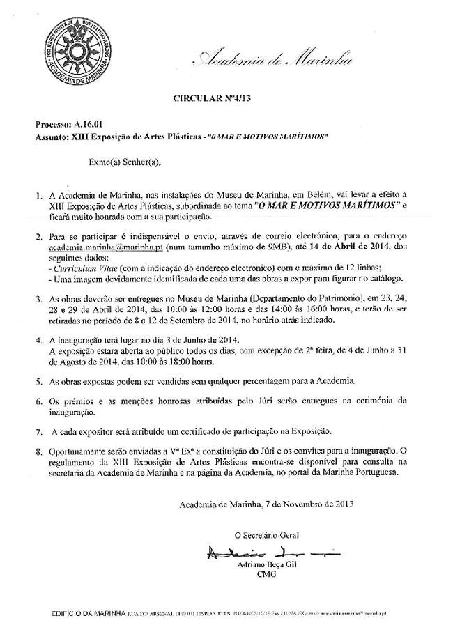A Capitania de Caminha divulga a circular n.º 4/13 da Academia da Marinha no sentido de proporcionar aos artistas locais a oportunidade de expor as suas obras no Museu de Marinha.