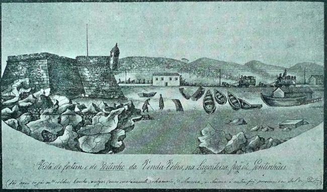 "Vista do Fortim e do Portinho da Venda Velha na Lagarteira, freguesia de Gontinhães" (desenho atribuído a Pinho Leal, cedido pela revista "O Tripeiro"). Arquivo do Alto Minho. 3º Volume (III da 1ª série) - [1948-1950], p.20.