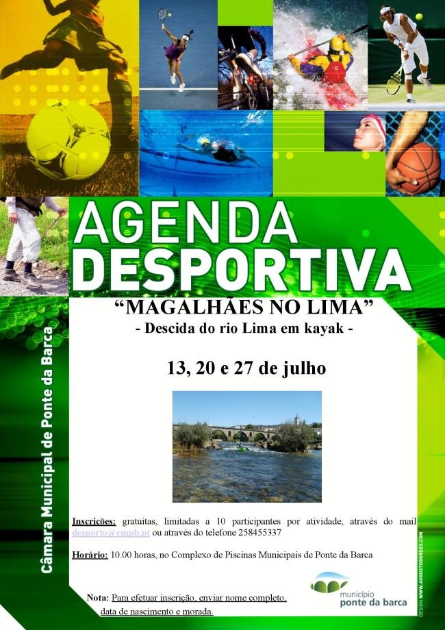 A Câmara Municipal de Ponte da Barca promove nos próximos dias 13, 20 e 27 de julho, descidas do rio Lima em kayak "Magalhães no Lima". As inscrições, que são gratuitas mas limitadas a 10 participantes por atividades, podem ser feitas através do email: desporto@cmpb.pt ou através do telf nº 258455337.