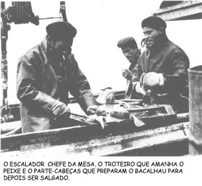 De regresso ao navio, as mãos já estavam lavadas com a água salgada permanentemente manipulada. Sacudiam-se, apenas ou esfregavam-se a qualquer coisa para poupar toalha. Depois da refeição a bordo do navio, começava o longo trabalho da escala e da salga se a pesca fosse abundante.