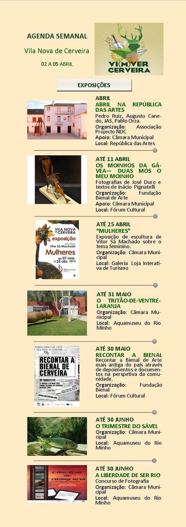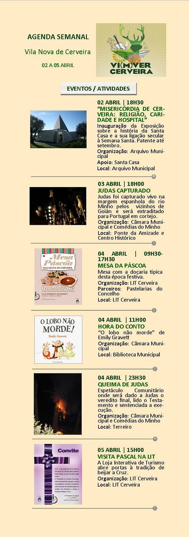 Para sábado, 04 de abril, pelas 23h30, a Comédias do Minho e a Câmara Municipal de Vila Nova de Cerveira apresentam, no Terreiro, a "Queima de Judas 2015". Este espetáculo conta, este ano, com a encenação de Ricardo Neves-Neves e com a participação do grupo de teatro Outra Cena e de elementos da comunidade cerveirense e goianes.