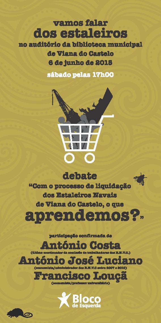 A 6 de Junho de 2015, pelas 17:00 horas, na Sala Couto Viana, na Biblioteca Municipal de Viana do Castelo, o Bloco de Esquerda promove um debate subordinado ao tema: "Com o processo de liquidação dos Estaleiros Navais de Viana do Castelo, o que aprendemos", que contará com a participação de Francisco Louçã, António José Luciano e António Costa.