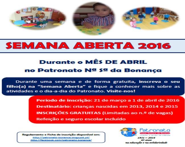 "O Patronato Nossa Senhora da Bonança, Instituição Particular de Solidariedade Social, que completa no presente ano o seu 65º Aniversário ao serviço da educação e da solidariedade, irá mais uma vez dinamizar a Semana Aberta nas suas instalações. Esta iniciativa tem como objetivo dar a conhecer as atividades e o dia-a-dia do Patronato à comunidade.
