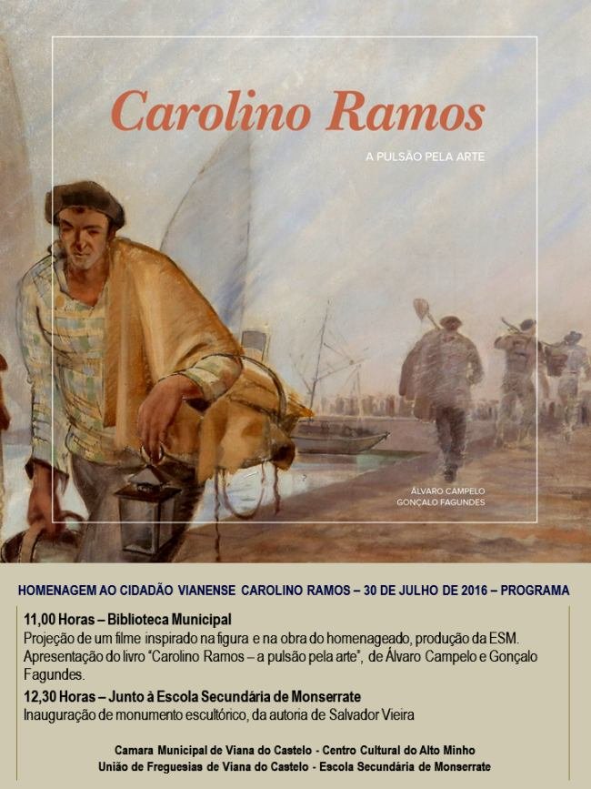 Este devotado cidadão vianense e artista multifacetado, vai ser alvo de diversas homenagens já no dia 30, sábado próximo. Nas mesmas, em salutar parceria, souberam envolver-se a Câmara Municipal, o Centro Cultural do Alto Minho, a União de Freguesias de Viana (Monserrate e Santa Maria Maior) e Meadela, e a Escola Secundária de Monserrate, herdeira da antiga Escola Industrial e Comercial de Viana do Castelo, onde Carolino Ramos foi docente. Estas entidades, com o contributo ativo e generoso de Salvador Vieira, que foi discípulo de Mestre Carolino, vão proporcionar a apresentação de um filme que tem CR como figura central (Escola Secundária de Monserrate); o lançamento do livro "Carolino Ramos - a pulsão pela Arte" de Álvaro Campelo e Gonçalo Fagundes (Centro Cultural do Alto Minho e Município), obra que procura enquadrar o Artista no contexto da arte em Viana e Portugal; e a inauguração do monumento escultórico junto à escola de Monserrate, de Salvador Vieira (União de Freguesias de Viana e Município). Os atos iniciam-se na Biblioteca Municipal, pelas 11 horas, com a apresentação do filme, a que se segue a cerimónia de apresentação da obra escrita. Concluídas estas cerimónias, junto ao monumento, será este inaugurado.