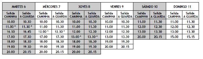Durante esta semana, dende o martes día 6 ao domingo 11 de setembro os horarios serán os seguintes: