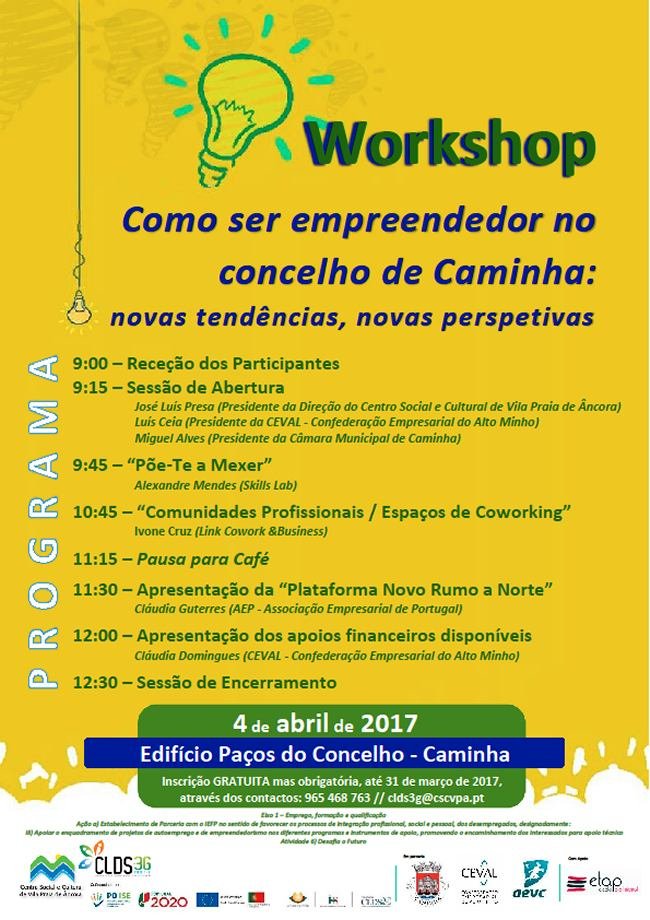 O Centro Social e Cultural de Vila Praia de Âncora, enquanto entidade coordenadora local de parceria do CLDS-3G Caminha, em parceria com o GAAE - Gabinete de Apoio às Atividades Económicas do Município e a AEVC - Associação Empresarial de Viana do Castelo pretendem desenvolver um workshop no próximo dia 4 de abril, a iniciar pelas 9 horas, no Edifício Paços do Concelho, em Caminha, intitulado "Como ser Empreendedor no concelho de Caminha: novas tendências, novas perspetivas".