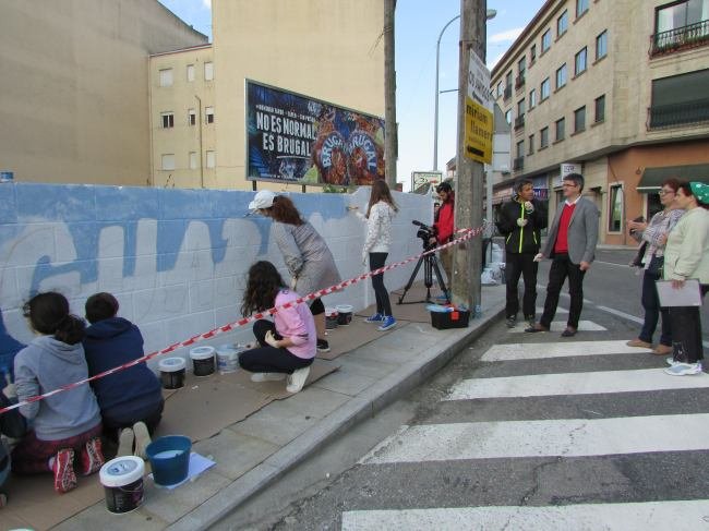 Os alumnos e alumnas da clase de 3º da ESO do Instituto A Sangriña están traballando na realización dun mural situado xunto a Alameda, na Rúa Galicia, e o alcalde da Guarda, Antonio Lomba e a Concelleira de Turismo, Montse Magallanes quixeron achegarse este xoves pola mañá ata o lugar.