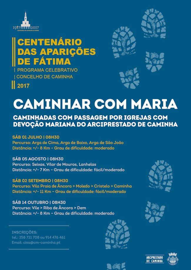 'Caminhar com Maria', caminhadas com passagem por igrejas com devoção Mariana do Arciprestado de Caminha, tem inicio sábado, dia 1 de julho. Esta iniciativa integra o programa celebrativo do Centenário das Aparições de Fátima que está a decorrer no concelho de Caminha até outubro. As inscrições são gratuitas, mas obrigatórias.