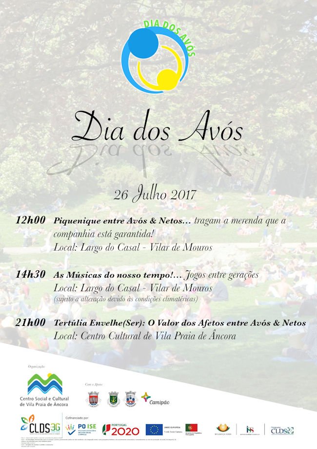 O Centro Social e Cultural de Vila Praia de Âncora pretende comemorar o Dia dos Avós - 26 de julho, através de algumas atividades a envolver idosos, jovens, crianças, voluntários e colaboradores da nossa Instituição, bem como a comunidade em geral residente no nosso concelho.