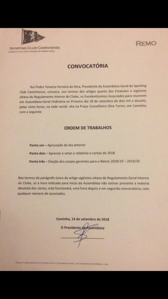 A assembleia está marcada para as 21 horas da próxima Sexta-feira, na sede do clube, mas é provável que acabe por ser transferida para o salão nobre da Associação Humanitária dos Bombeiros Voluntários de Caminha.