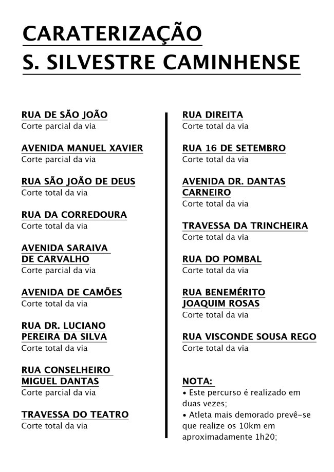 A I São Silvestre de Caminha é composta por uma corrida e uma caminhada. A corrida, com um percurso de 10 km, dirige-se para atletas federados e não federados. A caminhada, com um percurso de 5 km, destina-se a todas as faixas etárias e não tem fins competitivos.