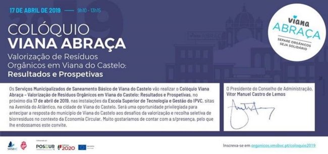 No dia 17 de abril, os SMSBVC vão realizar o colóquio "Viana Abraça - Valorização de Resíduos Orgânicos em Viana do Castelo - Resultados e Prospetivas", nas instalações da Escola Superior de Tecnologia e Gestão do Instituto Politécnico de Viana do Castelo (ESTG-IPVC).