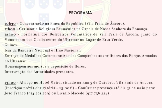 A Câmara de Caminha, a Junta de Freguesia e a Associação de Combatentes vão assinalar novamente no próximo dia 10 de Junho, o Dia de Portugal e das Comunidades, com o seguinte programa: