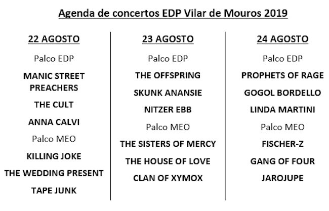 A organização do EDP Vilar de Mouros acaba de anunciar as últimas bandas que completam o cartaz da edição de 2019, com destaque para os britânicos The Cult, que atuam no dia 22 de agosto. Segundo a organização "Os The Cult são Vilar de Mouros. O EDP Vilar de Mouros é The Cult. Uma banda de culto para um festival de culto". As novidades passam pela presença dos portugueses TAPE JUNK, a 22 de agosto, que trazem o seu rock inconfundível ao festival, e ainda pela atuação dos acarinhados Jarojupe, a mais antiga banda de rock minhota, a 24 de agosto.