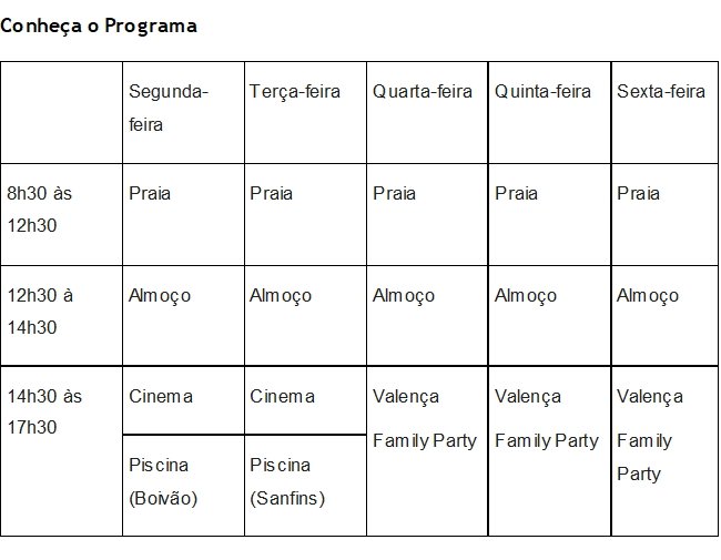 As manhãs serão na praia, segue-se almoço e a tarde é para cinema, piscina e parque temático "Family Party" Valença.