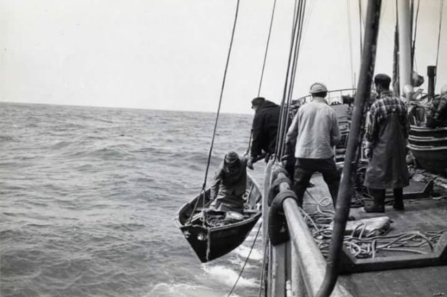 A pesca do bacalhau à linha em dóris de um só homem, inédita na história das pescarias no noroeste do Atlântico, assentava em bases de trabalho escravo. Esta condição arrancava aos homens que o praticaram sentimentos moralmente negativos que endureciam o seu caráter. A dureza das condições climatéricas, conjugada com a fragilidade de um pequeno dóri sem qualquer condição de segurança e a solidão absoluta, ainda mais sentida quando o denso nevoeiro se abatia em redor, não permitindo mais que um palmo à frente do nariz de campo visual, onde os olhos pudessem distrair-se com a aparição dos belos e perigosos ycebergs em passagem e das baleias, das aves marinhas atentas a qualquer sinal de um simples isco a boiar, ou a banharem-se na eminência de uma tempestade, ou ainda, da visão de um pedaço de terra negra no enevoado da distância e o navio-mãe ao longe ancorado com os seus altos mastros quase a emergir da superfície do mar; a parca e quase sempre invariável componente alimentar a bordo à base de peixe fresco cozido com batatas, feijão ou grão para variar, cozidos com água salgada para poupar a água doce racionada, que constituía a única refeição quente do dia e era tomada ao fim de intensas jornadas de trabalho de catorze a dezasseis horas ou mais a bordo dos dóris, desde os "louvados" às rituais quatro horas da madrugada seguidas, variavelmente, de mais umas quantas horas conforme a duração do processamento do peixe a bordo do navio - escala, lavagem e salga - determinada pelas quantidades de bacalhau capturadas pelos dóris. Daí o descanso ser quase sempre muito escasso.