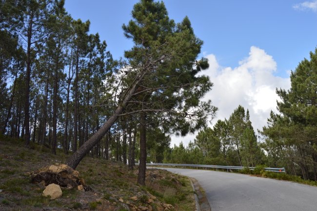 Árvore arrancada do solo e sustentada num galho de um pinheiro em risco de cair na estrada